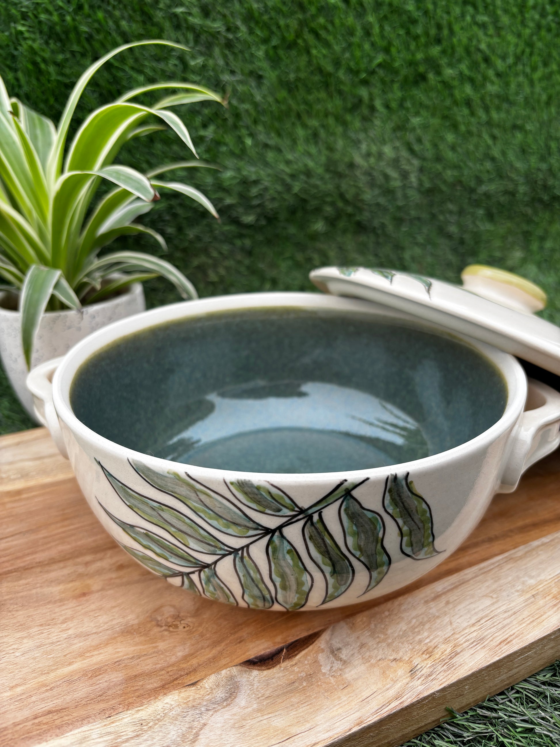 Serve everyday meals with effortless elegance. This handcrafted ceramic casserole features delicate hand-painted leaf motifs on a warm neutral base, designed to keep food warm while elevating your table aesthetic.