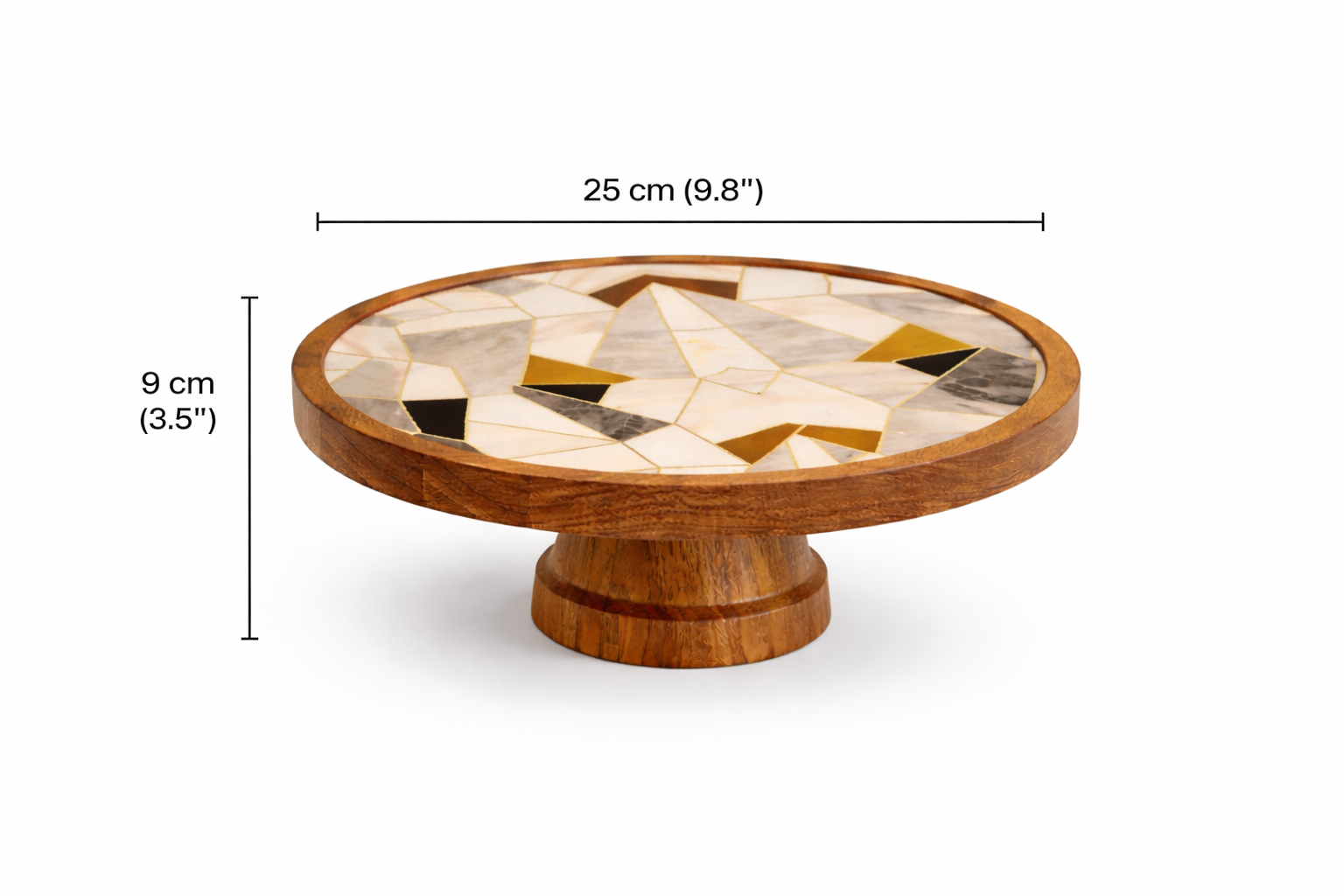 The geometric inlay creates a soft bloom-like pattern, giving the piece its signature character while the elevated pedestal adds height and elegance to your table setting. Whether you're serving cakes, pastries, or celebratory treats, it brings a luxurious yet earthy charm to every occasion.