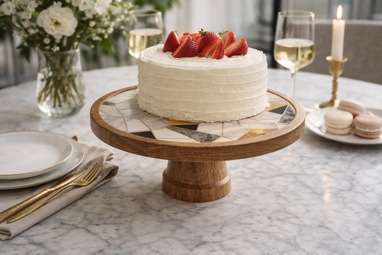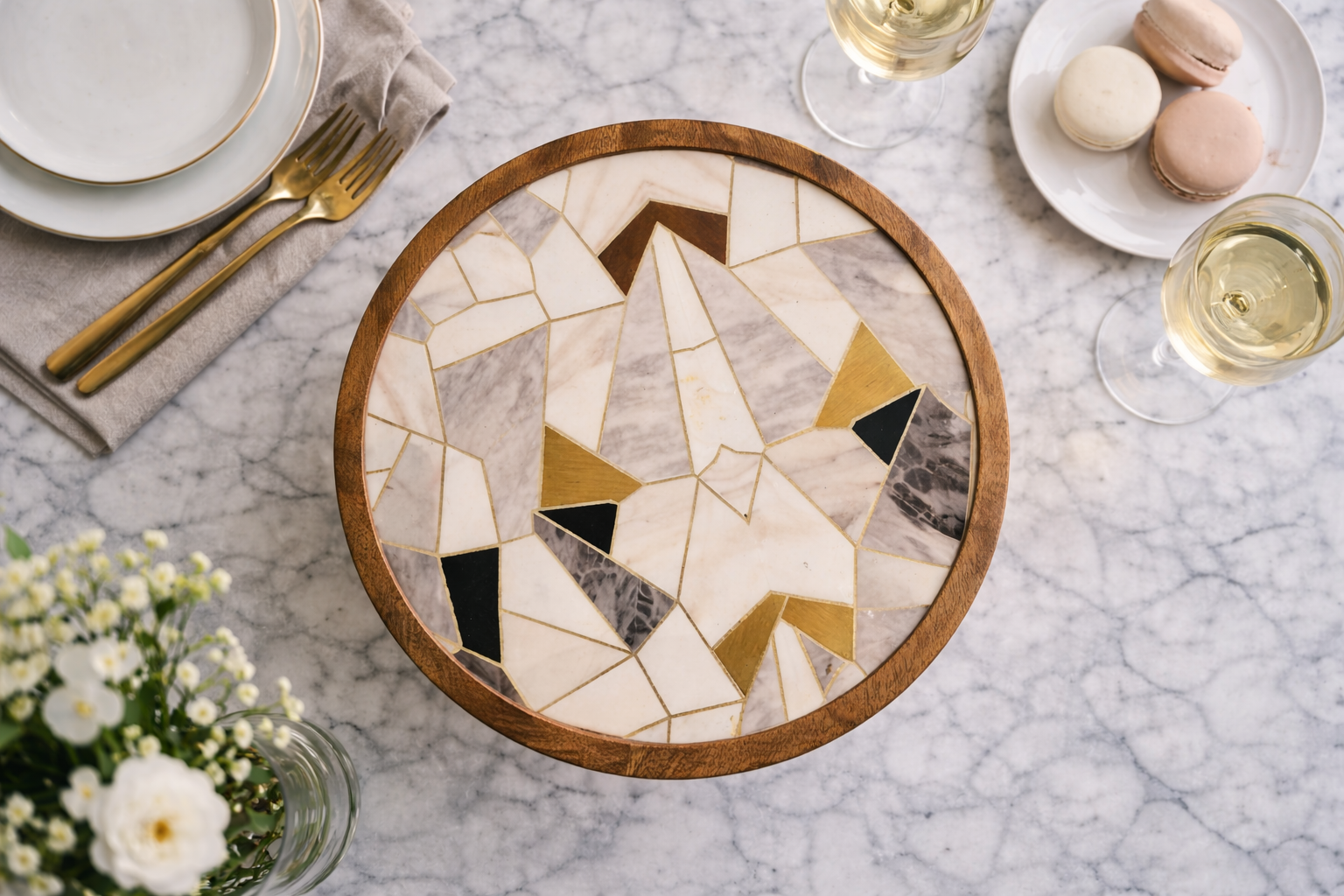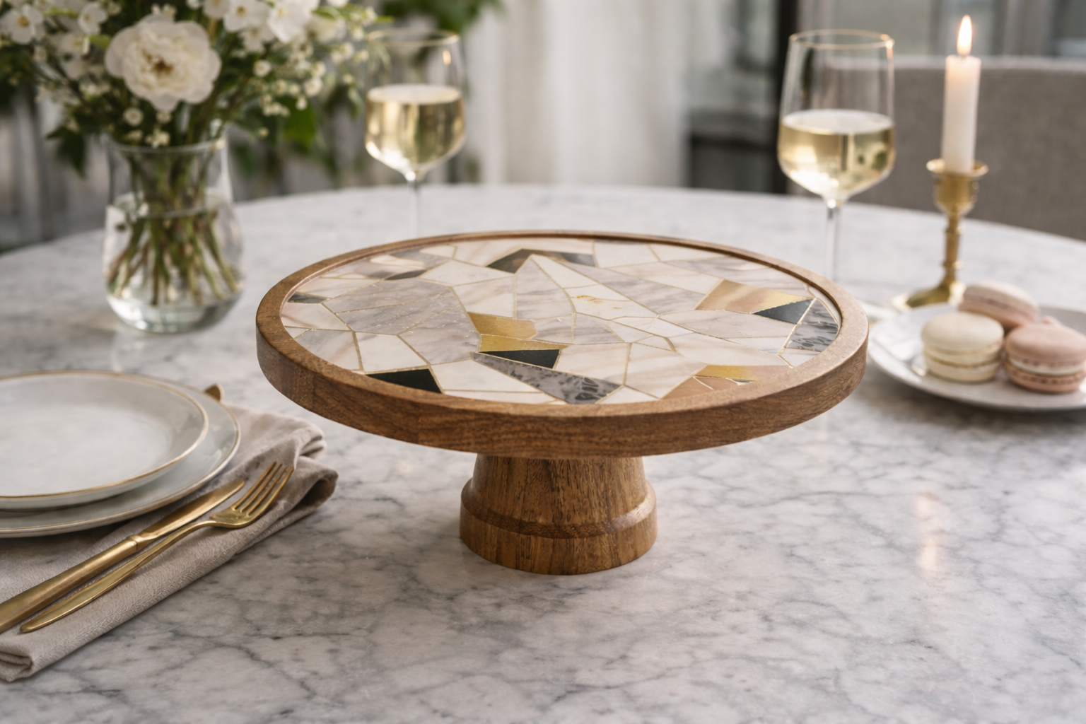 Where natural textures meet refined design, the Marble Bloom Cake Stand turns every dessert into a centerpiece. Crafted with a warm wooden base and topped with an intricate mosaic of marble, stone, and gold-toned accents, this stand is designed to feel both artistic and timeless.