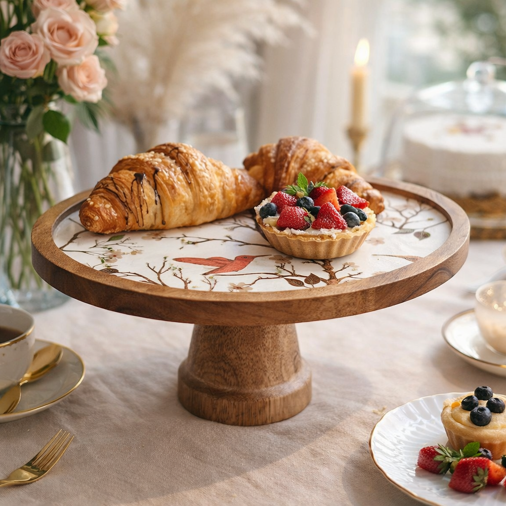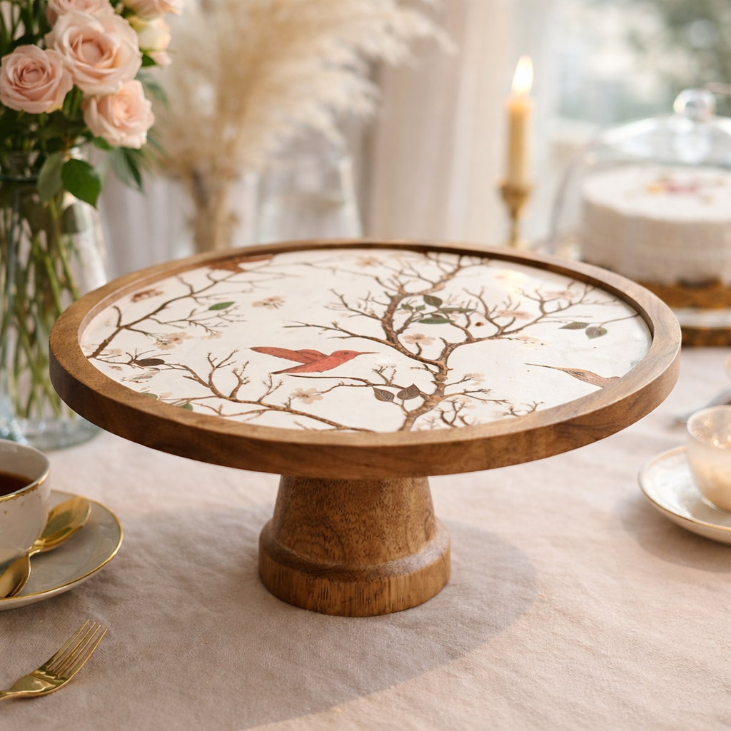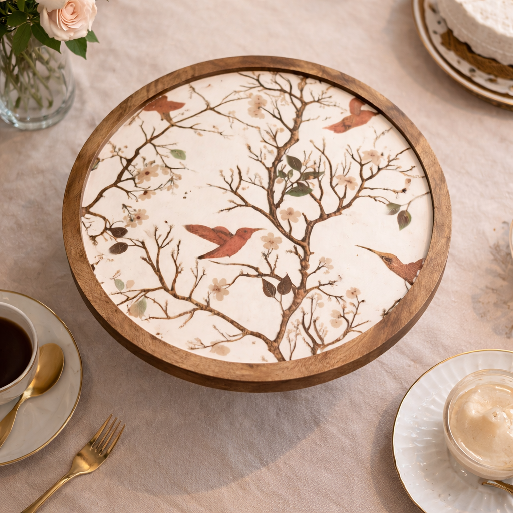 Bring quiet elegance to your table with the Whispering Branches Stand, where art and function meet beautifully. Crafted with a sturdy wooden base and a delicately designed top, this stand features graceful branches, soft blossoms, and charming birds that create a serene, nature inspired look.